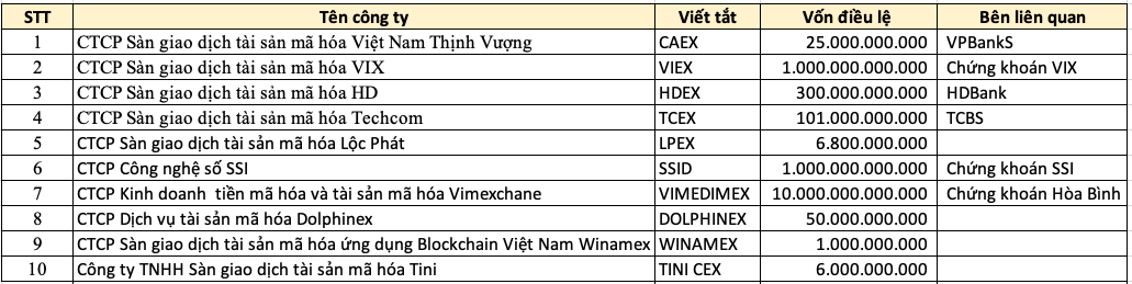 Theo thống kê sơ bộ, hiện có gần 10 doanh nghiệp được thành lập với định hướng hoạt động trong lĩnh vực sàn giao dịch tài sản mã hóa, trong đó không ít cái tên mới xuất hiện chỉ trong vài tháng gần đây.