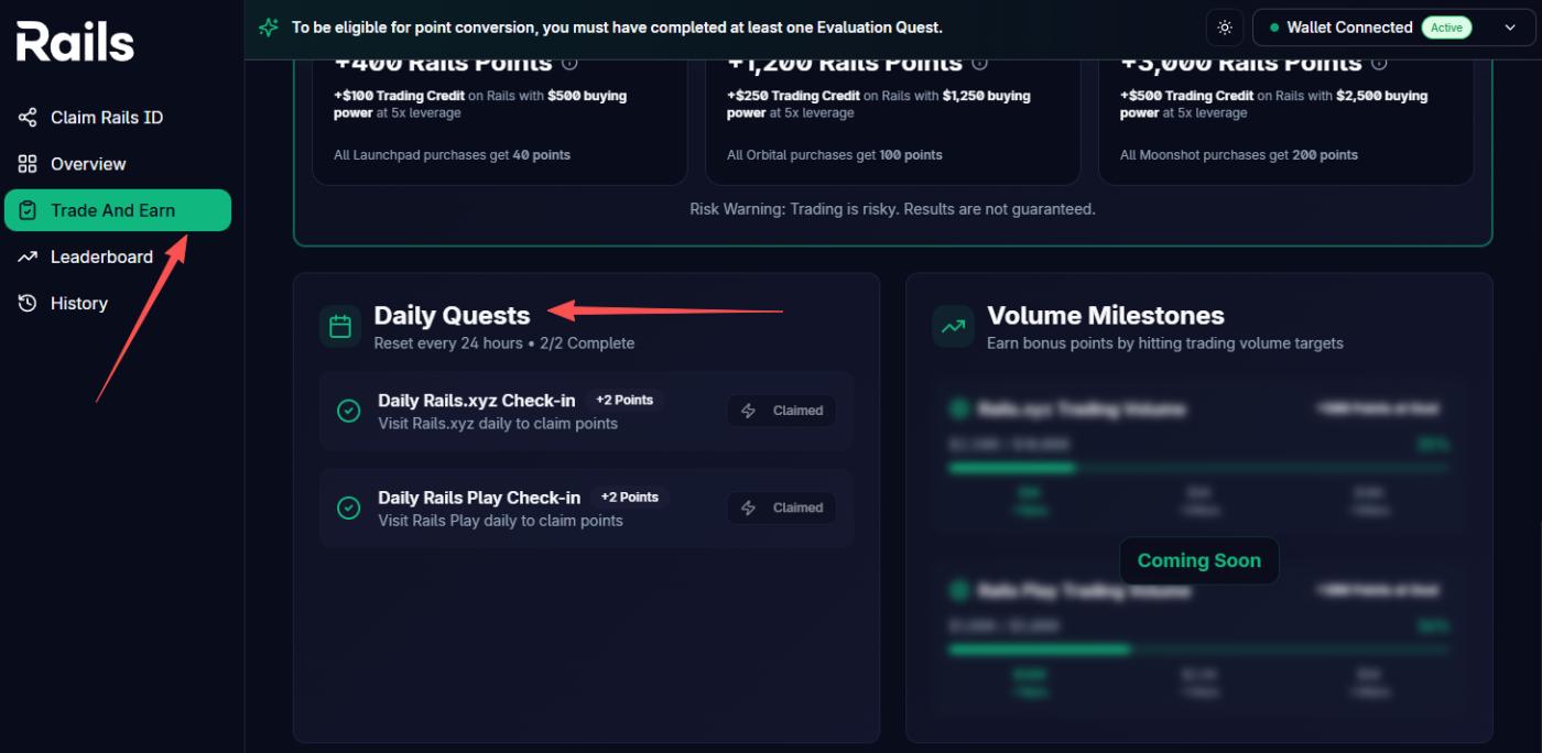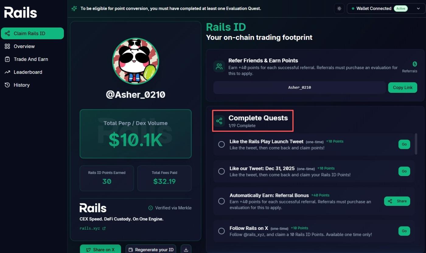 Vào ngày 20 tháng 1, Rails đã thông báo trên nền tảng X rằng công cụ kiểm tra ví Rails Wallet Checker đã ra mắt. Người dùng cần xác minh số dư điểm Rails Points của mình trước thời hạn kiếm điểm là 7:59 sáng giờ Bắc Kinh ngày 2 tháng 2. Điều quan trọng cần lưu ý là chỉ những người dùng tư cách mua ít nhất một trải nghiệm Rails Play mới tư cách kiếm điểm Rails ID Points.