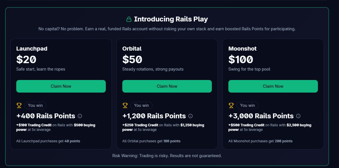Rails là một nền tảng giao dịch hợp đồng vĩnh cửu sử dụng kiến trúc lai. Nền tảng này sử dụng cơ chế khớp lệnh tập trung để cải thiện tốc độ thực thi, trong khi tiền được lưu ký hoàn toàn trên Chuỗi . Được xây dựng trên mạng Layer 2 của Kraken , nền tảng này hỗ trợ thực thi giao dịch độ trễ thấp và cung cấp bằng chứng Chuỗi để xác minh tính bảo mật của tiền và tính minh bạch của giao dịch. Dự án đã nhận được đầu tư từ nhiều tổ chức, bao gồm Kraken Ventures và Slow Ventures, huy động được tổng cộng 20,2 triệu đô la.