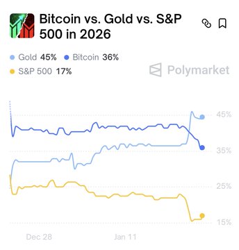 🚨TIN MỚI: TỶ LỆ VÀNG VƯỢT TRỘI HƠN BITCOIN TRONG NĂM 2026 ĐẢO NGƯỢC TỶ LỆ BITCOIN Vàng vượt qua Bitcoin về tỷ lệ cược hiệu suất năm 2026, với các nhà giao dịch dự đoán có 45% khả năng vàng sẽ đánh bại BTC và chỉ số S&P 500.