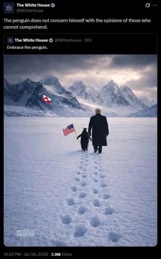 Sáng hôm qua lúc 6 giờ sáng, tài khoản X của Nhà Trắng đã đăng một dòng tweet có nội dung "Hãy ôm chú chim cánh cụt", kèm theo hình ảnh chú chim cánh cụt Nietzsche đang cầm cờ Mỹ và đi cùng Trump về phía một tảng băng trôi ở xa.