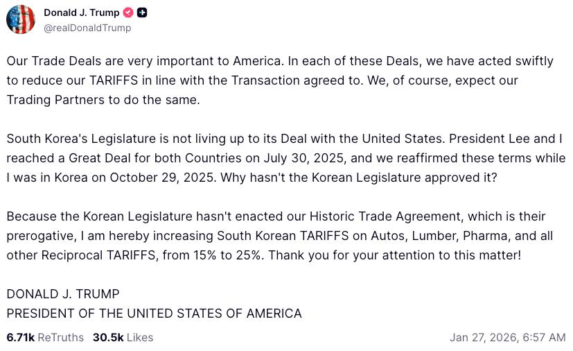 Hôm thứ Hai, Trump đăng trên Truth Social rằng ông sẽ tăng thuế đối với ô tô, phụ tùng ô tô, gỗ, dược phẩm của Hàn Quốc và áp thuế đối ứng từ 15% lên 25%, đồng thời cáo buộc quốc hội nước này không luật hóa thỏa thuận thương mại đạt được với Washington hồi tháng Bảy. Tuy nhiên, chưa có sắc lệnh hành pháp nào được ban hành.