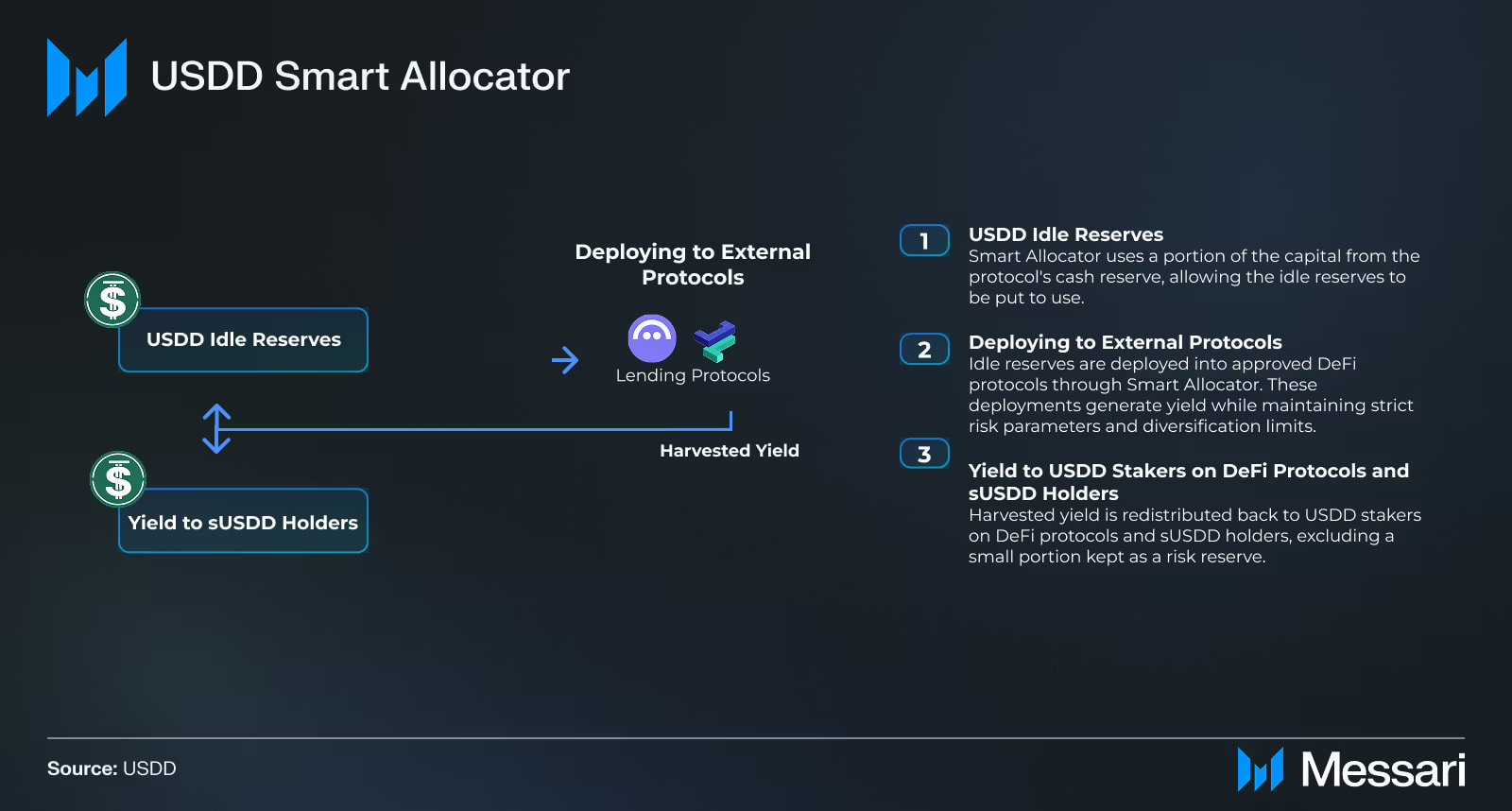 Vào tháng 6 năm 2025, USDD đã ra mắt Smart Allocator, một chương trình sử dụng dự trữ nhàn rỗi để tạo ra lợi ích thực và trả lại cho người dùng. Tính đến nay, Smart Allocator đã tạo ra hơn 9 triệu đô la lợi nhuận.