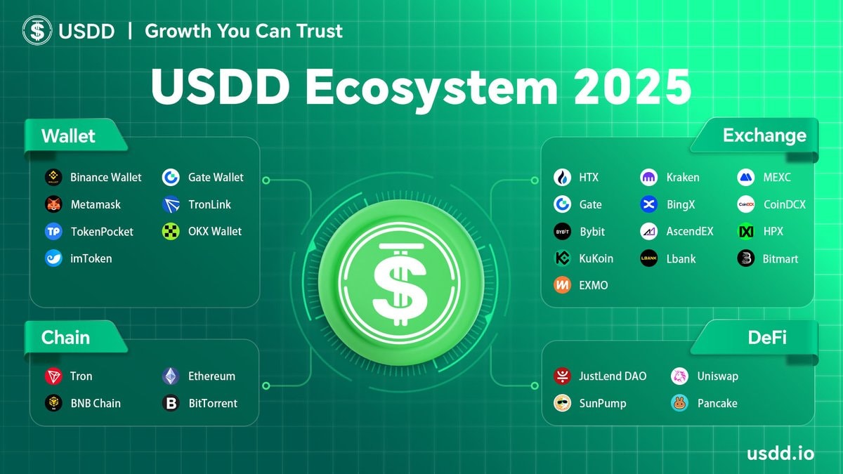 Vào tháng 12 năm 2025, USDD tiếp tục mở rộng quan hệ đối tác trong hệ sinh thái của mình, hợp tác với sàn giao dịch , ví điện tử và giao thức DeFi hàng đầu, bao gồm cả Binance Wallet, mở rộng đáng kể phạm vi tiếp cận người dùng và giúp tổng giá trị tài sản bị khóa (TVL) của USDD vượt qua ngưỡng kháng cự quan trọng 1 tỷ đô la.