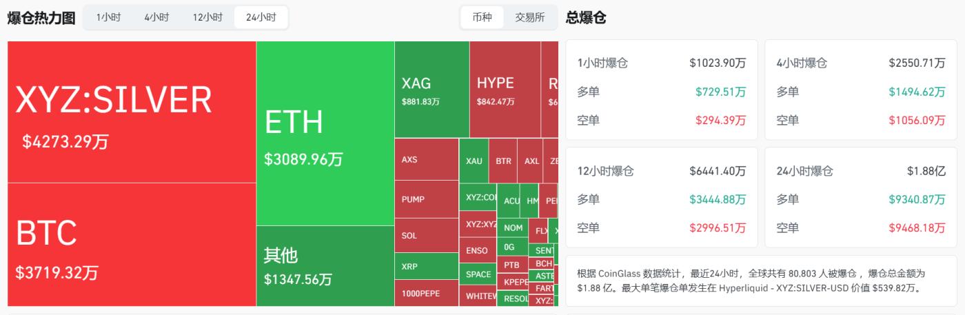 Cháy tài khoản của XYZ:SILVER đạt 42,7329 triệu đô la, cháy tài khoản BTC đạt 37,1932 triệu đô la và cháy tài khoản 30,8996 triệu đô la. Trong 24 giờ qua, 80.803 người đã bị thanh lý, với cháy tài khoản lớn nhất diễn ra trên cặp giao dịch Hyperliquid XYZ:SILVER-USD, trị giá 5,3982 triệu đô la.