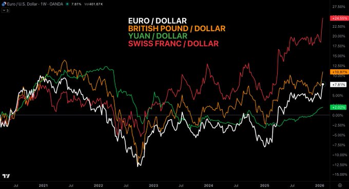 Đồng đô la Mỹ đang giảm mạnh so với MỌI loại tiền tệ: - Mức thấp nhất trong 3 năm so với Nhân dân tệ Trung Quốc - Mức thấp nhất trong 4 năm so với Bảng Anh - Mức thấp nhất trong 5 năm so với Euro - Mức thấp nhất trong 15 năm so với Franc Thụy Sĩ