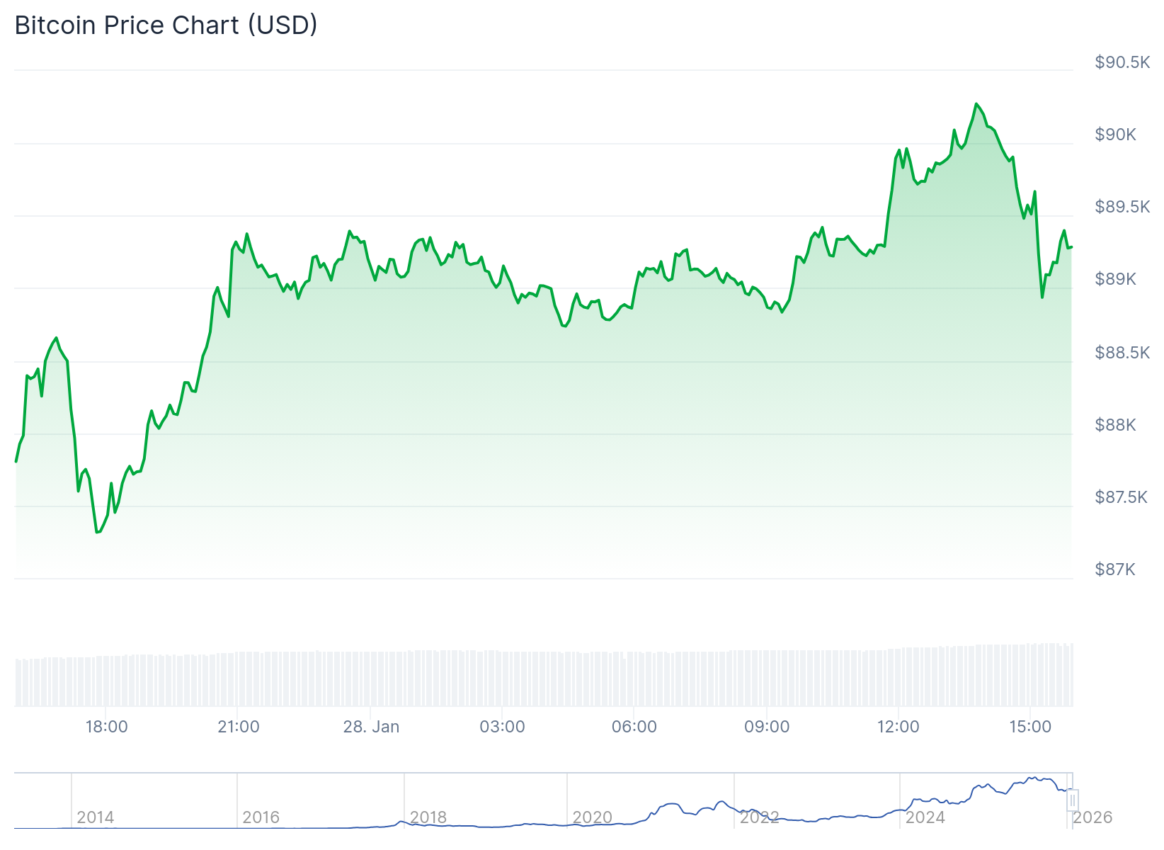 Tại thời điểm viết bài, Bitcoin ( BTC ) đang giao dịch quanh mức 89.500 đô la, tăng gần 2% trong 24 giờ qua và không đổi so với tuần trước.