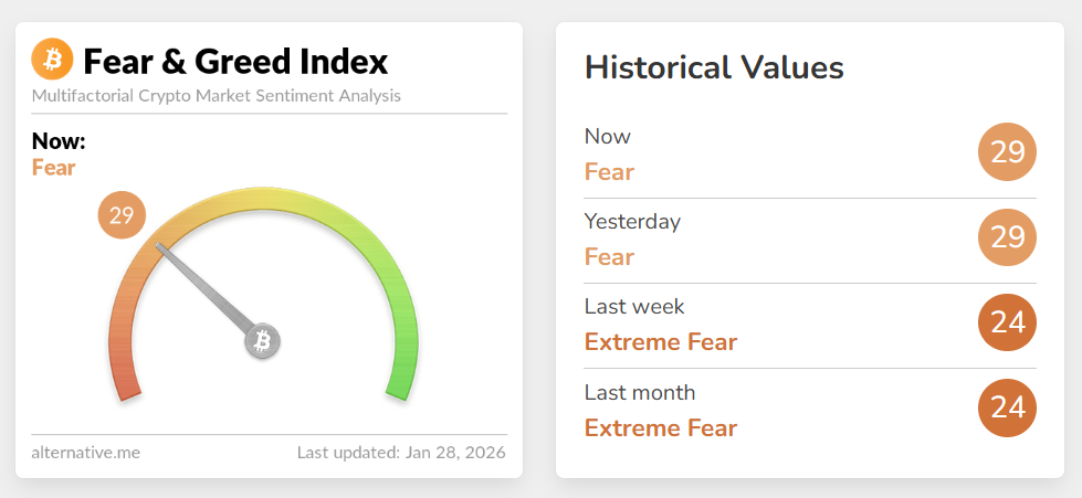 Theo Chỉ số Sợ hãi & Tham lam trong thị trường tiền điện tử , tâm lý nhà đầu tư vẫn nằm trong vùng "sợ hãi" khi các nhà giao dịch vẫn thận trọng bất chấp sự phục hồi gần đây của thị trường.