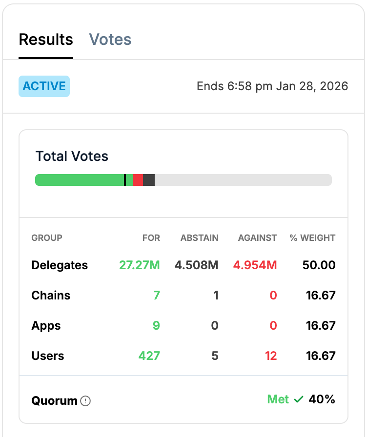 Cuộc bỏ phiếu — đã đạt đủ số đại biểu tham dự vào hôm nay, ngày 28 tháng 1, ngay trước khi dự kiến kết thúc lúc 1:58 chiều giờ ET — cho phép phân bổ 50% doanh thu của máy giải trình tự Superchain cho việc mua OP hàng tháng, hiện đang chờ một cuộc bỏ phiếu chung cuối cùng của Hạ viện, yêu cầu đa số 60%.
