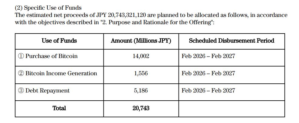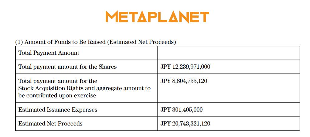 Metaplanet cho biết số tiền thu được từ vòng gọi vốn chủ yếu sẽ được sử dụng để tăng Bitcoin và đầu tư vào việc kinh doanh lợi nhuận Bitcoin , đồng thời trả bớt một phần khoản vay tín dụng. Tính đến năm 2025, công ty nắm giữ 35.102 Bitcoin.