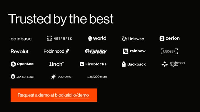 Blockaid là nhà cung cấp bảo mật onchain hàng đầu, được @coinbase, @MetaMask, Uniswap và nhiều đơn vị khác tin dùng để phát hiện, hiểu và bảo vệ chống lại gian lận, lừa đảo và các lỗ hổng bảo mật trong thời gian thực.