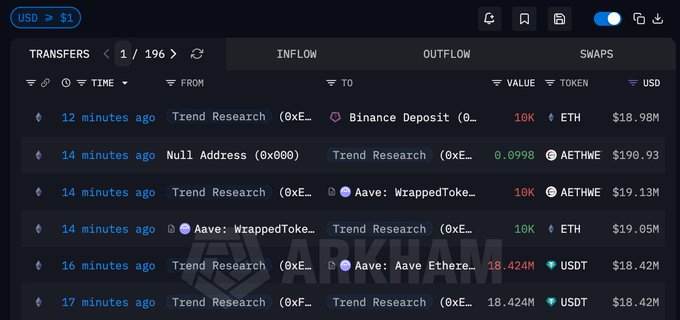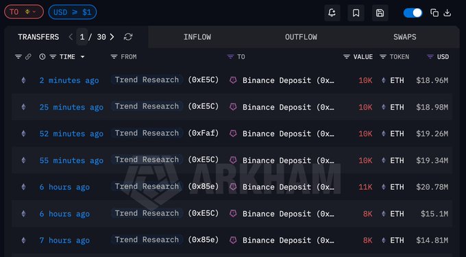 Trend Research tiếp tục nỗ lực hướng tới mốc 20000 $ETH Nạp tiền vào Binance 👀