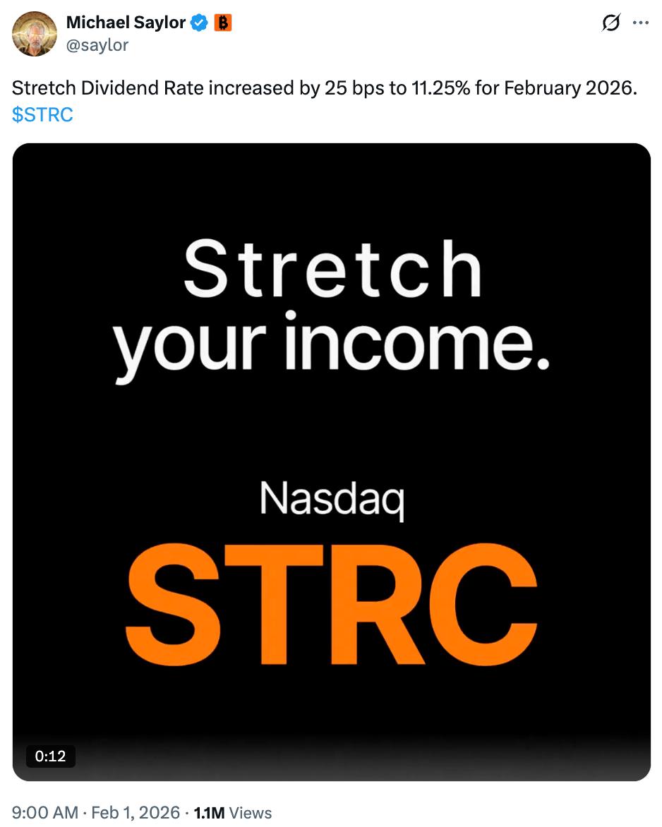 Ngày 1 tháng 2, người sáng lập Strategy, Michael Saylor, thông báo rằng lợi suất cổ tức tháng 2 của cổ phiếu ưu đãi vĩnh cửu STRC của Strategy sẽ được tăng thêm 25 điểm cơ bản lên 11,25%. Lợi suất cổ tức được điều chỉnh hàng tháng. Strategy có thể huy động thêm vốn để tăng lượng Bitcoin nắm giữ bằng cách phát hành cổ phiếu thông qua cơ chế ATM (Đấu giá trực tiếp) được liên kết với sản phẩm.