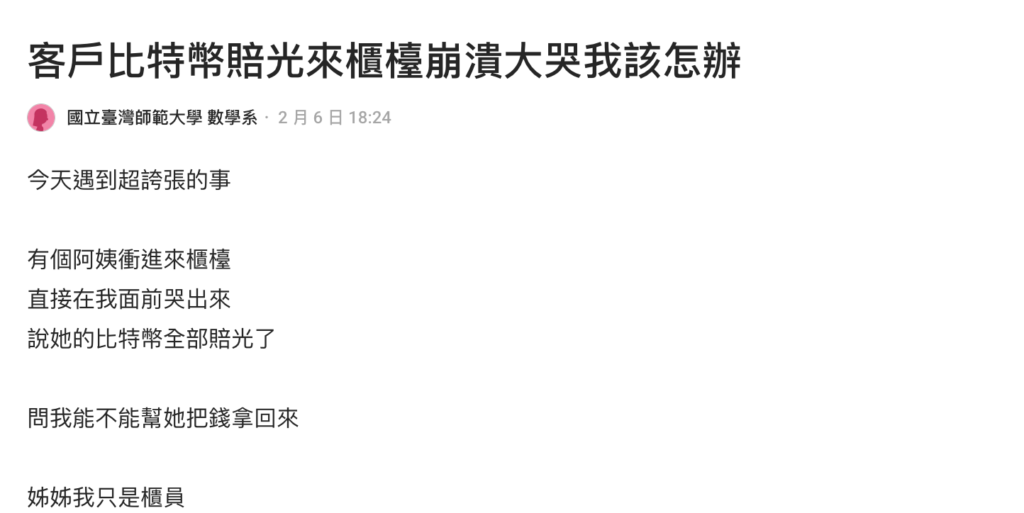 Một bài đăng gần đây trên diễn đàn tài chính của Dcard, nơi một nhân viên ngân hàng cầu cứu, đã khơi mào một cuộc thảo luận cộng đồng. Bài đăng ngắn gọn nhưng mô tả chính xác tình trạng nhà đầu tư bán lẻ đã mất tiền trong giao dịch và muốn tìm kiếm công lý cũng như giải tỏa tâm lý. Mặc dù logic hoàn toàn phi lý, tâm lý thì hoàn toàn dễ hiểu.