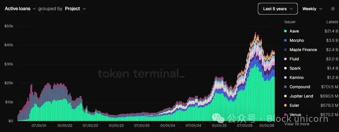 Bảng điều khiển cho thấy nền tảng được xây dựng bởi các giao thức hàng đầu như Aave và Morpho rất vững chắc, với hoạt động cho vay tích cực vượt quá 40 tỷ đô la trong những tháng gần đây, gấp hơn hai lần mức đỉnh điểm vào năm 2022.