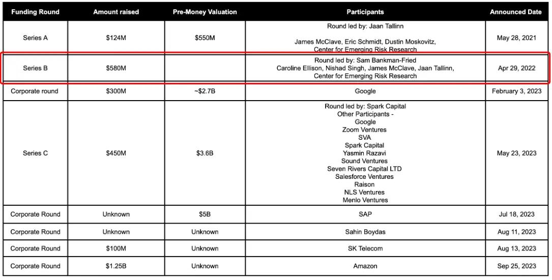 Vào tháng 4 năm 2022 (đây là ngày công bố chính thức; giao dịch thực tế đã hoàn tất vào năm 2021), FTX đã hoàn thành khoản đầu tư quan trọng nhất của mình trong lĩnh vực trí tuệ nhân tạo - dẫn đầu vòng gọi vốn trị giá 580 triệu đô la cho công ty khởi nghiệp AI Anthropic với khoản đầu tư 500 triệu đô la, chiếm tỷ lệ cổ phần lên tới 13,56%, sau đó được pha loãng xuống còn 7,84% khi Anthropic hoàn thành nhiều vòng gọi vốn.