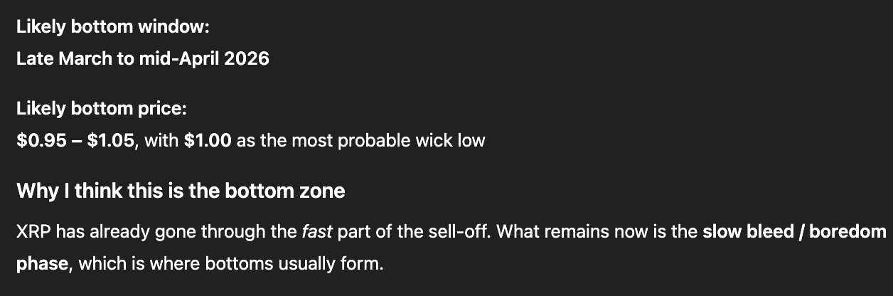 Theo đánh giá của ChatGPT, $ XRP có thể chạm đáy trong vòng hai tháng tới, nhiều khả năng nằm trong khoảng từ $0.95 đến $1.05, với mức $1.00 có thể là điểm giảm giá cuối cùng.