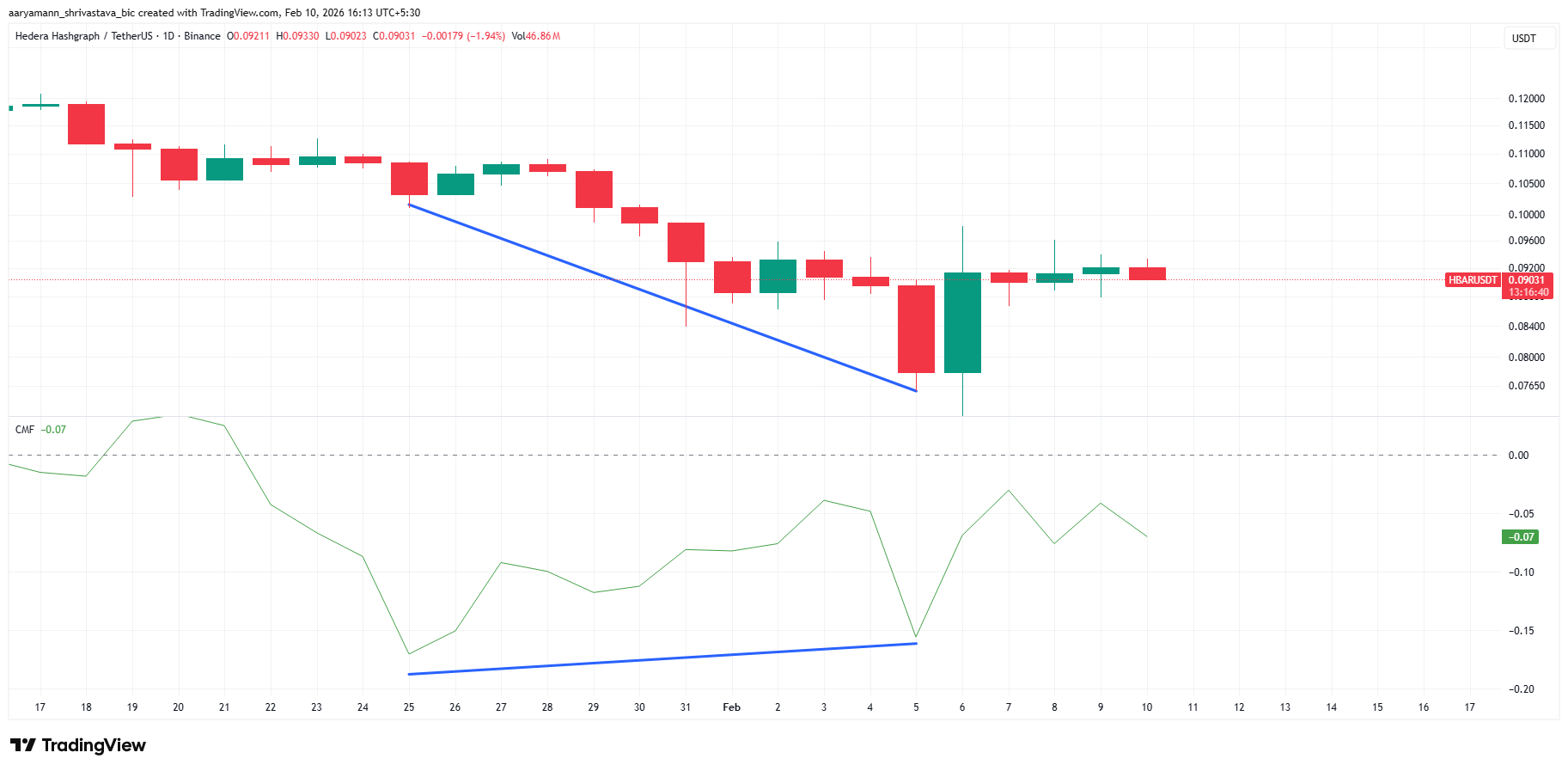 Bản đồ thanh khoản HBAR >Các tín hiệu động lượng on-chain cho thấy một bức tranh hỗn hợp. Dòng tiền Chaikin (CMF) đã hình thành sự phân kỳ tăng giá so với mức đáy thấp hơn của giá vào đầu tuần này. Trong khi giá tiếp tục giảm, CMF lại có xu hướng tăng, cho thấy áp lực bán đang giảm bớt chứ không phải gia tăng.