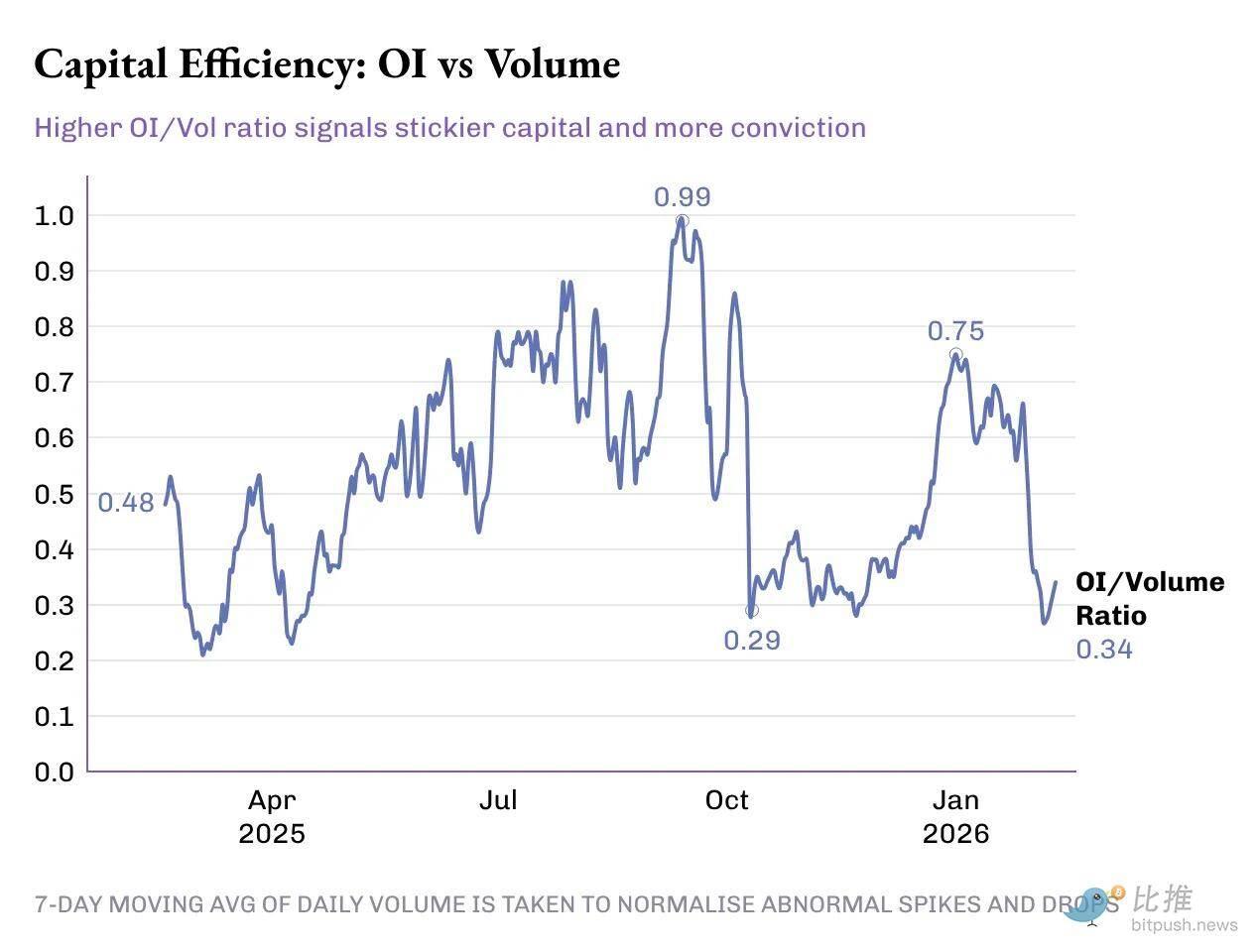 Một chiến thắng rõ ràng hơn nằm ở tăng trưởng của tỷ lệ OI/khối lượng giao dịch. Đây là tín hiệu trực tiếp cho thấy "vốn kiên nhẫn" sẵn sàng tin tưởng và đặt cược vào các sản phẩm và thị trường khác nhau đang nổi lên trên sàn giao dịch vĩnh cửu.