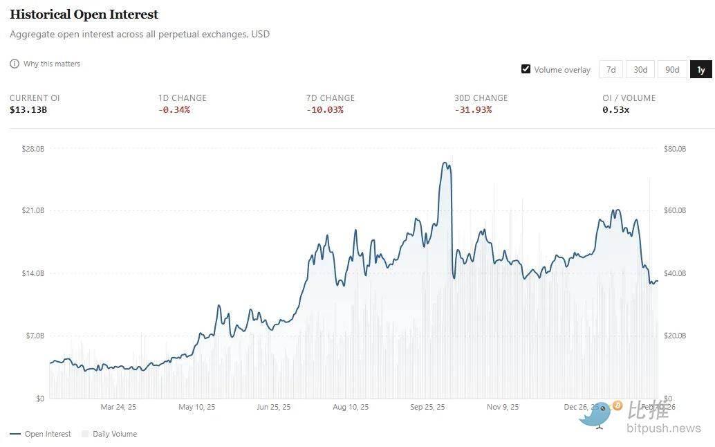 Giai đoạn 1 (Tháng 2 - Tháng 5 năm 2025): Giai đoạn yên tĩnh. Tỷ lệ OI/Khối lượng giao dịch trung bình xấp xỉ 0,46 lần, OI trung bình xấp xỉ 4,8 tỷ đô la, và khối lượng giao dịch hàng ngày trung bình xấp xỉ 11,5 tỷ đô la.