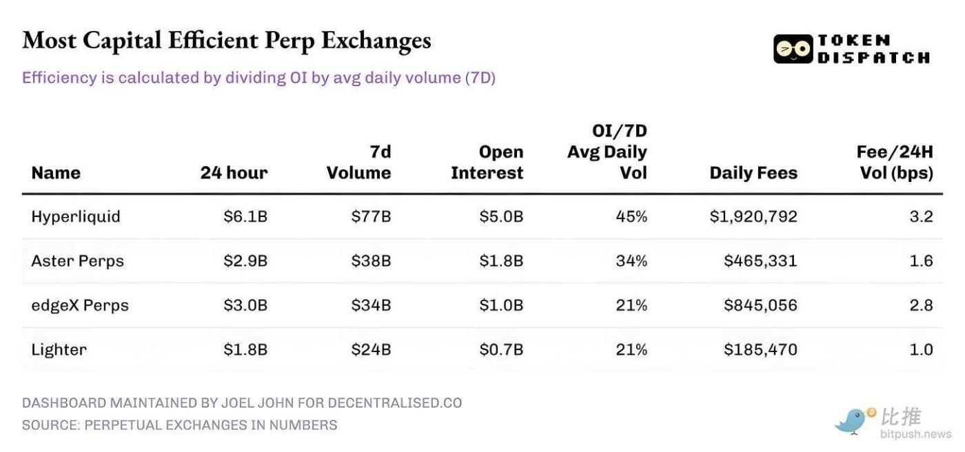edgeX và Lighter: Cả hai đều có hiệu suất tương tự nhau trên bậc thang hiệu quả sử dụng vốn, với tỷ lệ OI/Vol là 21%. Tuy nhiên, edgeX tương đương với Hyperliquid về khả năng kiếm tiền từ phí giao dịch, ở mức 2,8 bps.