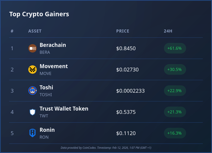 Những đồng tiền điện tử có hiệu suất cao nhất hôm nay: 💠 $BERA (+61,6%) 🚀 💠 $MOVE (+30,5%) 💠 $TOSHI (+22,9%) 💠 $TWT (+21,3%) 💠 $RON (+16,3%) @berachain tiếp tục đà tăng trưởng nhanh chóng, kéo dài mức tăng 7 ngày lên +101%!