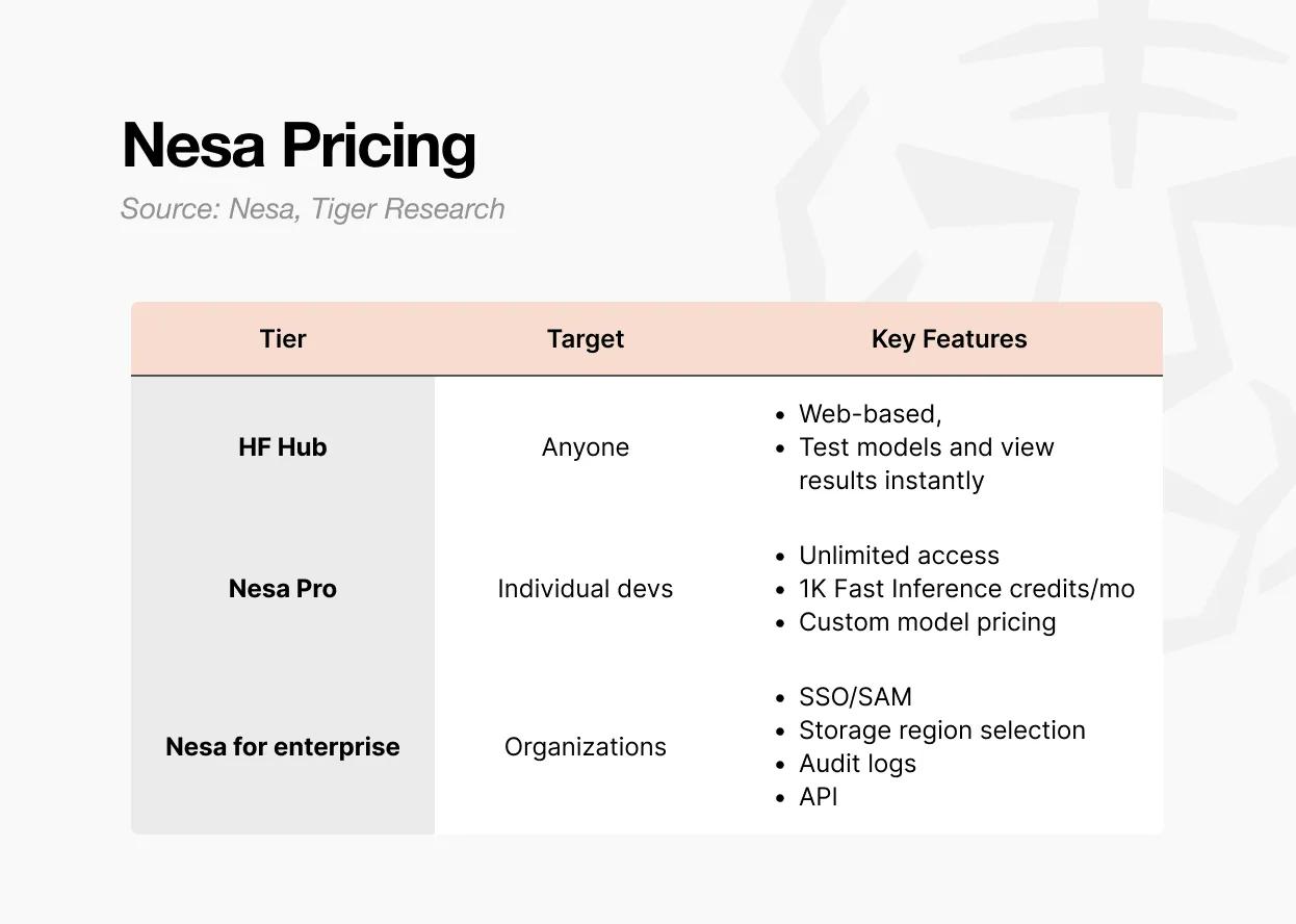 Giá khởi điểm là 20 đô la Mỹ/người dùng/tháng, nhưng các điều khoản thực tế có thể thương lượng tùy thuộc vào quy mô. Sản phẩm được thiết kế dành cho các tổ chức tích hợp Nesa vào quy trình AI nội bộ của họ, cung cấp quyền truy cập API và khả năng quản lý cấp tổ chức thông qua một giao thức riêng biệt.