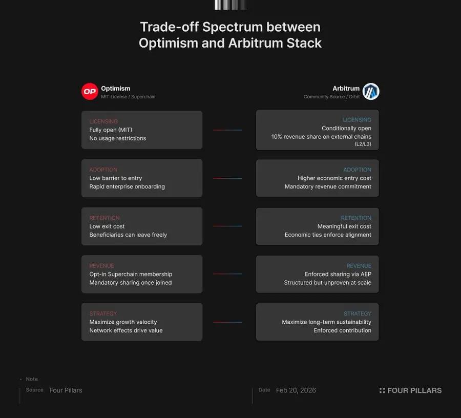 Tuy nhiên, sự khác biệt giữa hai mô hình này không quá lớn như người ta thường mô tả. Arbitrum cũng cung cấp giấy phép miễn phí và không cần cấp phép trong hệ sinh thái của mình, còn Optimism yêu cầu các thành viên Chuỗi chia sẻ lợi nhuận . Cả hai đều nằm trên phổ giữa "hoàn toàn mở" và "hoàn toàn bắt buộc", khác nhau về mức độ và phạm vi hơn là bản chất.