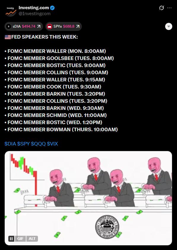 Một loạt phát biểu từ các quan chức Fed sẽ diễn ra liên tục từ thứ Hai đến thứ Tư, gồm có các Thống đốc Christopher Waller, Lisa Cook, Chủ tịch Fed Chicago Austan Goolsbee, Chủ tịch Fed Atlanta Raphael Bostic và nhiều người khác.