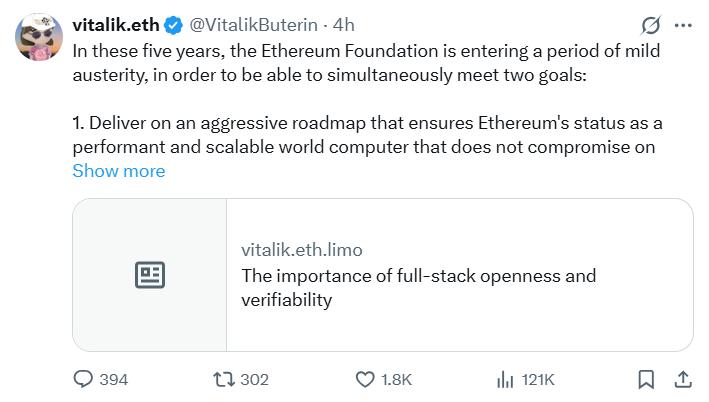 Đối diện giai đoạn thị trường khó khăn, Quỹ Ethereum(EF) đã thực hiện một sự thay đổi mang tính phòng thủ trong chiến lược tài chính của mình. Vitalik Buterin tuyên bố rằng quỹ sẽ bước vào giai đoạn "thắt lưng buộc bụng vừa phải" kéo dài 5 năm.