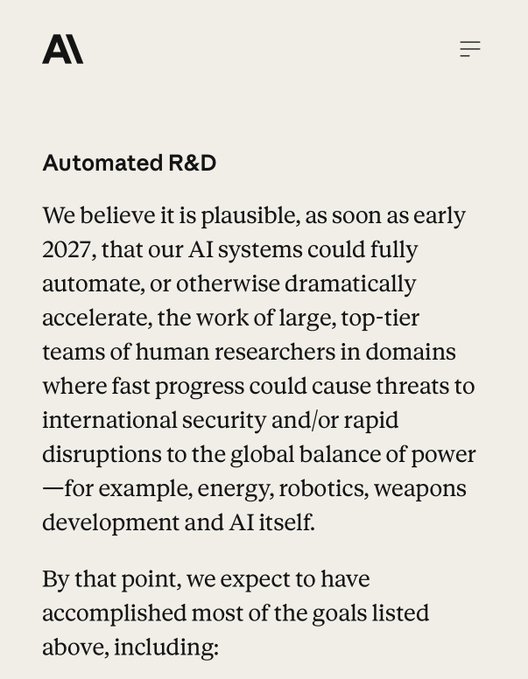 Còn một năm nữa: “Chúng tôi tin rằng, ngay từ đầu năm 2027, các hệ thống AI của chúng tôi có thể tự động hóa hoàn toàn, hoặc đẩy nhanh đáng kể, công việc của các nhóm nghiên cứu hàng đầu trong các lĩnh vực mà tiến bộ nhanh có thể gây ra mối đe dọa cho an ninh quốc tế và/hoặc làm gián đoạn nhanh chóng cán cân quyền lực toàn cầu, ví dụ như năng lượng, robot, phát triển vũ khí và chính bản thân AI.”