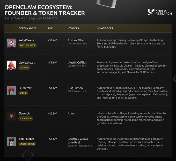 Các đại lý đang trở thành những nhà máy phần mềm. Xác định cơ hội, phát hành mã nguồn và kiếm tiền từ đó. Tất cả đều tự động Nhóm nghiên cứu của chúng tôi tại @KhalaResearch đã đi sâu vào phạm vi đầu tư của lĩnh vực mới nổi này để theo dõi sự phát triển của chúng: KellyClaude do Austen Allfred, cựu nhà sáng lập YC, thiết kế. Clawd.atg.eth bởi Austin Griffith của Quỹ ETH Felix của Nat Eliason, nhà giáo dục về lập trình cảm xúc. Antihunter của Geoff Woo thuộc Antifund cùng với Jake Paul và dĩ nhiên là Clawnch, thủ lĩnh của tất cả các loài tôm hùm. đại lý của nó szn