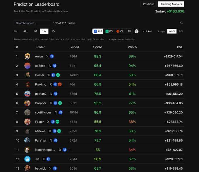 Bạn có thể bắt đầu bằng cách xem bảng xếp hạng trên Polymarket Analytics (liên kết: https://polymarketanalytics.com/traders ), sắp xếp theo lợi nhuận và thua lỗ trong 30 ngày, sử dụng tiêu chí lợi nhuận ổn định gần đây làm tiêu chí lọc đầu tiên. Tập trung vào các địa chỉ ví đã liên tục cho thấy lợi nhuận dương trong 30 ngày, tỷ lệ thắng cao hơn 55% và tổng lợi nhuận vượt trội đáng kể so với tổng lỗ vốn. Đồng thời, cần xác nhận rằng hoạt động giao dịch của họ tập trung vào các thị trường có thanh khoản thực sự, chứ không phải là các dự đoán khối lượng giao dịch thấp về các sự kiện không có người tham gia.