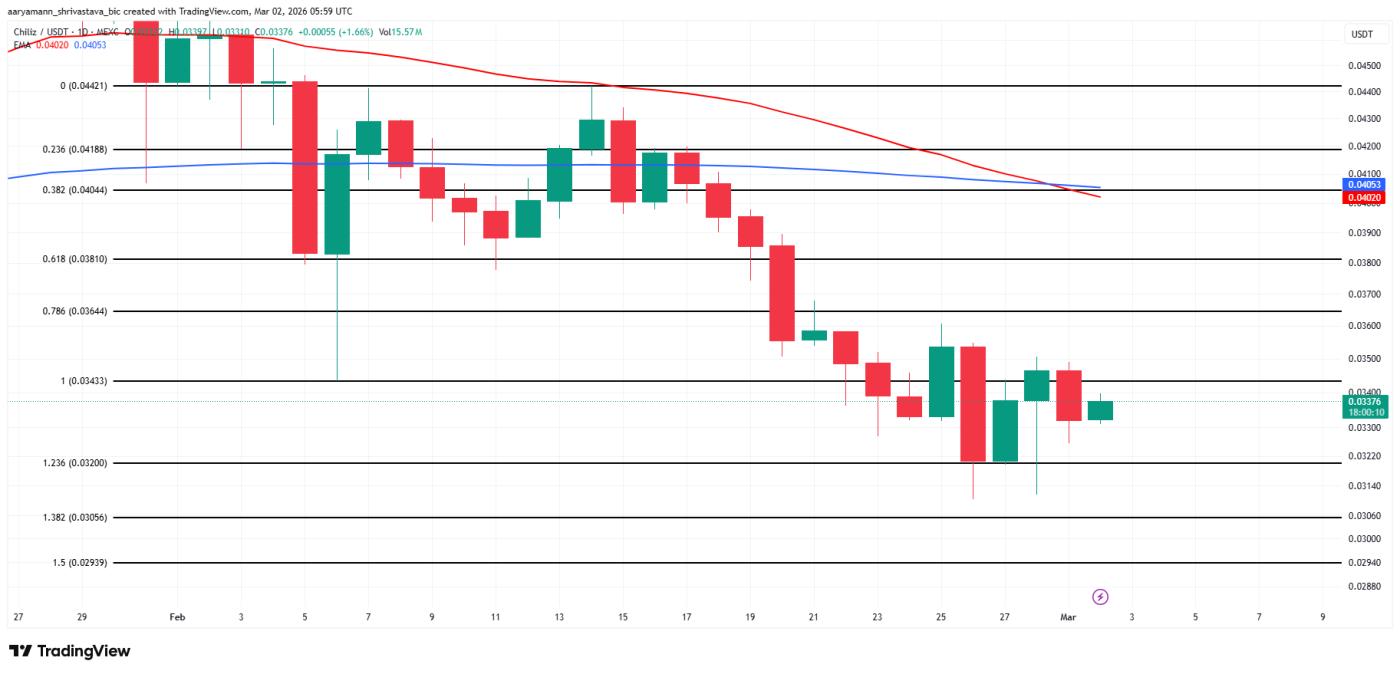 Tuy nhiên, điều kiện vĩ mô tiêu cực có thể cản trở đà phục hồi. CHZ gần đây hình thành Death Cross, báo hiệu xu hướng suy yếu. Nếu áp lực bán duy trì, giá có thể giảm dưới 0,032 USD và 0,030 USD, phủ nhận kịch bản tăng giá.
