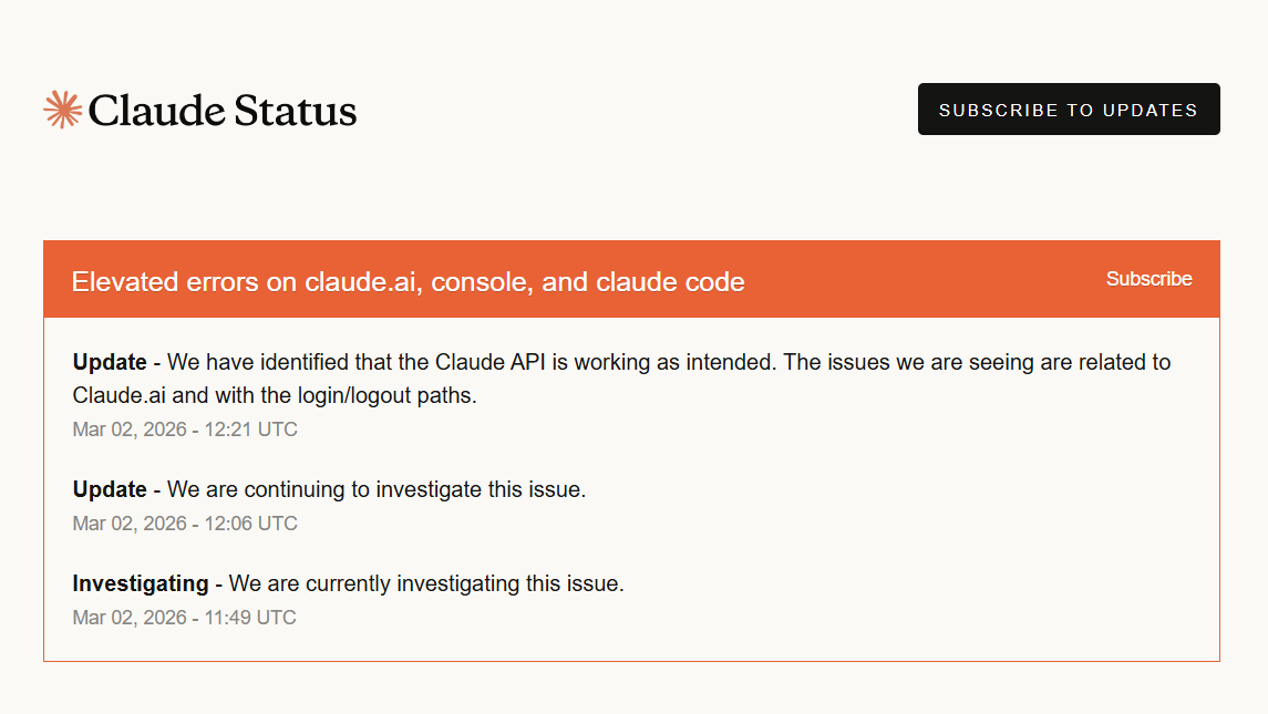 Vào ngày 2 tháng 3 năm 2026 , Claude (claude.ai), một chatbot phổ biến của công ty trí tuệ nhân tạo Anthropic, đã gặp sự cố ngừng hoạt động trên diện rộng, ảnh hưởng đến nhiều khu vực trên toàn thế giới. Theo dữ liệu từ trang trạng thái chính thức của Anthropic (status.claude.com) và trang web giám sát Downdetector, hàng nghìn người dùng đã báo cáo các sự cố như không thể đăng nhập, lỗi gửi dữ liệu hoặc lỗi HTTP 500. Sự cố này vẫn đang được điều tra.