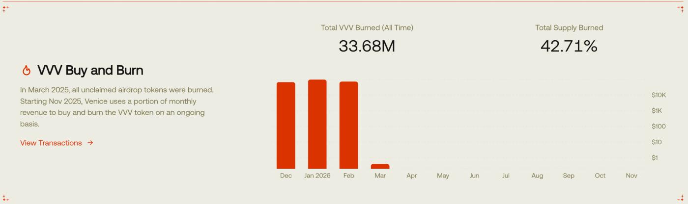 Bắt đầu từ tháng 10 năm 2025, Venice thông báo giảm kế hoạch phát hành ban đầu từ 10 triệu VVV/năm xuống còn 8 triệu VVV/năm, đồng thời triển khai cơ chế mua lại và đốt hàng tháng. Hiện tại, lượng token đốt hàng tháng nằm trong khoảng từ 30.000 đến 50.000 VVV, trị giá khoảng 60.000 đến 90.000 đô la Mỹ. Hiện nay, 42,71% tổng nguồn cung token đã bị đốt. Sau đó, vào đầu tháng 2 năm 2026, thông báo chính thức về một kế hoạch giảm phát hành khác đã giảm lượng VVV/năm xuống còn 6 triệu VVV/năm . Sê-Ri điều chỉnh này đã trực tiếp làm thay đổi kỳ vọng về nguồn cung. Từ góc độ giá token, đây là điểm khởi đầu cho sự tăng giá mạnh của VVV.