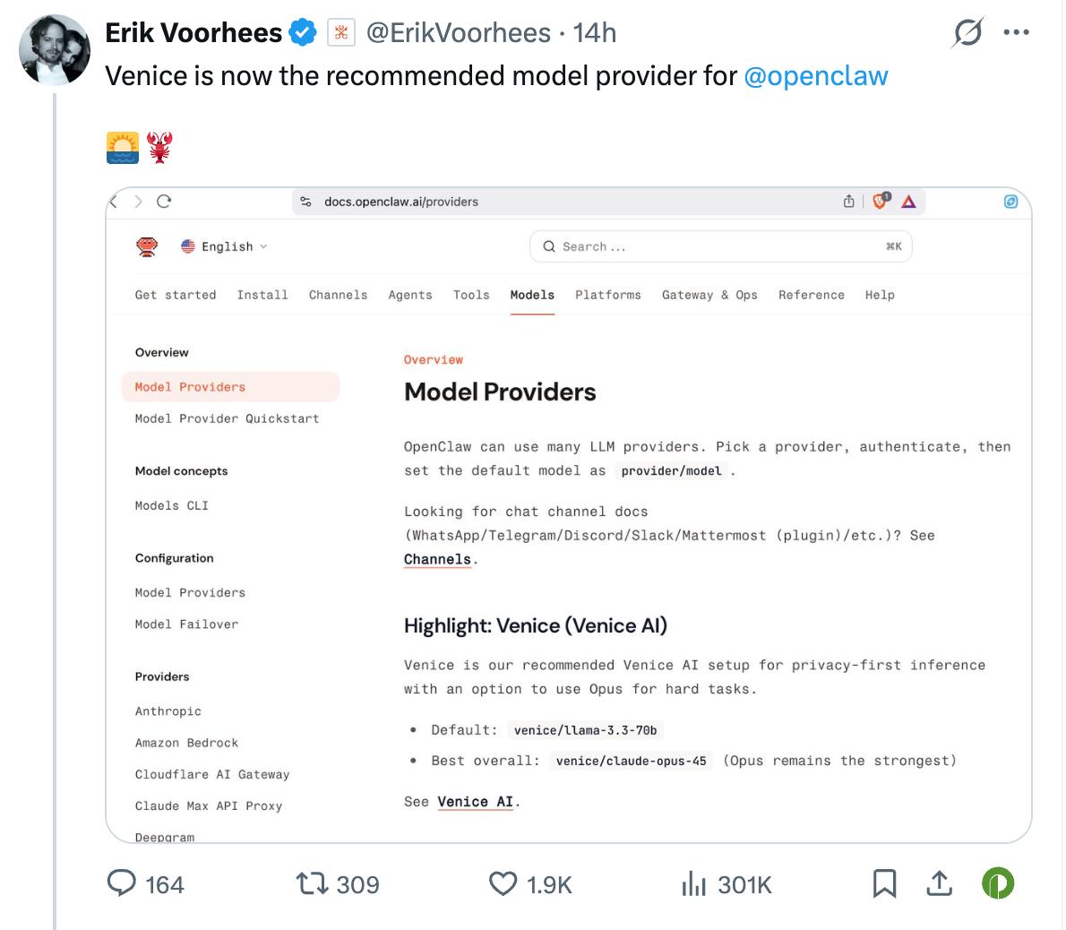 Hiện tại, OpenClaw có 22 nhà cung cấp mô hình, trong đó các công ty công nghệ lớn như Amazon, Anthropic và Cloudflare. Về quy mô và độ nhận diện thương hiệu, Venice rõ ràng không phải là nổi bật nhất, thậm chí có thể được coi là ít được chú ý nhất. Tuy nhiên, nó từng được nêu bật trong tài liệu chính thức như một nhà cung cấp mô hình với nền kinh tế token riêng. Tuy nhiên, việc nêu bật này có thể là một sai sót trong quá trình hợp nhất tài liệu; nó đã được xóa bỏ, nhưng Venice đã có trong danh sách các nhà cung cấp mô hình của OpenClaw từ khá lâu trước đây.
