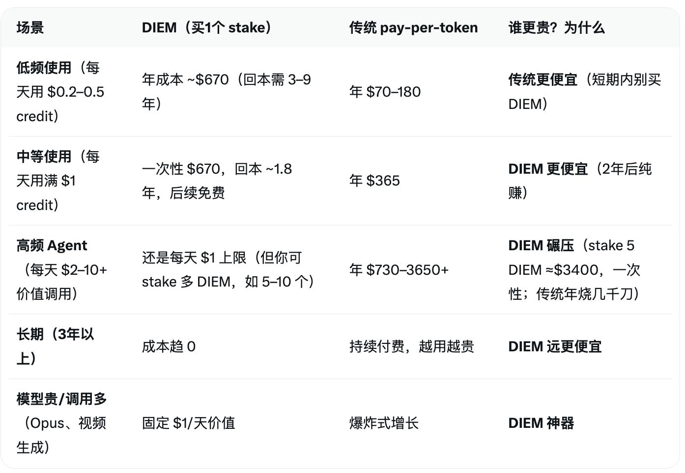 Dữ liệu trên cho thấy người dùng tần suất thấp hoàn toàn không cần mua DIEM. Đối với người dùng tần suất trung bình đến cao, những người cần chạy Agent và tạo ra lượng lớn nội dung mỗi ngày, chi phí cận biên sẽ tiếp tục giảm trong dài hạn, và IDEM có lợi thế rõ rệt.