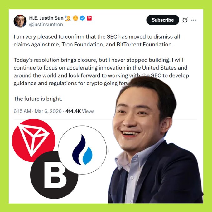 ⚖️ SEC khép lại vụ kiện Justin Sun, BitTorrent nộp phạt 10 triệu USD Ủy ban Chứng khoán và Giao dịch Mỹ (SEC) vừa đạt thỏa thuận dàn xếp trong vụ kiện kéo dài từ năm 2023 với Justin Sun và các tổ chức liên quan đến hệ sinh thái Tron. Theo phán quyết tại tòa án New York: > Rainberry Inc. (công ty phát triển BitTorrent) sẽ nộp phạt 10 triệu USD. > SEC rút toàn bộ cáo buộc đối với Justin Sun, Tron Foundation và BitTorrent Foundation. Đáng chú ý, việc rút đơn được thực hiện “with prejudice”, nghĩa là SEC không thể khởi kiện lại các cáo buộc tương tự trong tương lai. Các bên chấp nhận thỏa thuận nhưng không thừa nhận cũng không phủ nhận sai phạm. 📌 Vụ kiện bắt đầu từ 03/2023, khi SEC cáo buộc Justin Sun bán chứng khoán chưa đăng ký thông qua TRX và BTT, thao túng thị trường bằng wash trading và quảng bá token với người nổi tiếng mà không tiết lộ thù lao. Động thái dàn xếp này được xem là dấu hiệu cho thấy SEC đang có cách tiếp cận mềm mỏng hơn với crypto, sau khi cơ quan này cũng đạt thỏa thuận hoặc rút lui khỏi nhiều vụ kiện lớn trong ngành.