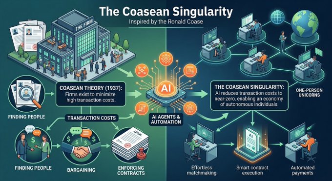 Coasen Singularity - firms exist to minimize transaction costs. If AI agents reduce these transaction costs to near-zero, economic need for large firms disappears, potentially leading to a "singular" economy of individuals or "one-person unicorns."