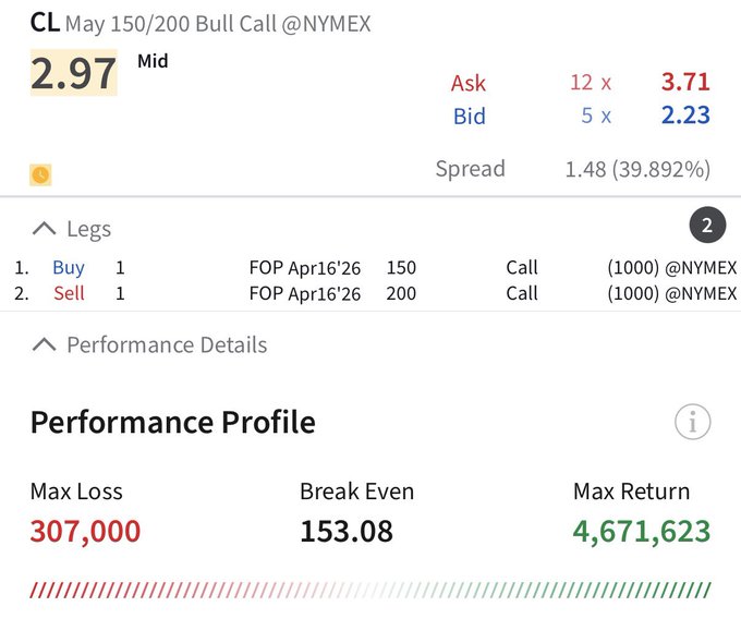Giá dầu thô tương lai đang được chào mua một cách điên cuồng. Lệnh mua quyền chọn giữa tháng 4 với giá thực hiện $150/$200 đang giao dịch ở mức $3,00. Lệnh mua quyền chọn $200 đang giao dịch ở mức gần $3,00. #OOTT