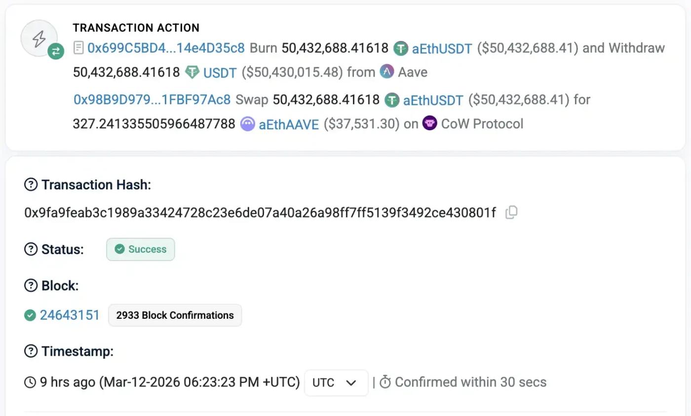 Bước đầu tiên, số aEthUSDT (chứng chỉ USDT sinh lãi) mà người dùng nắm giữ trên Aave V3 đã được quy đổi thành 50,43 triệu USDT. Đây là một hoạt động quy đổi nội bộ trong giao thức, và toàn bộ số tiền đã được ghi có vào tài khoản của người dùng mà không bị mất mát gì.