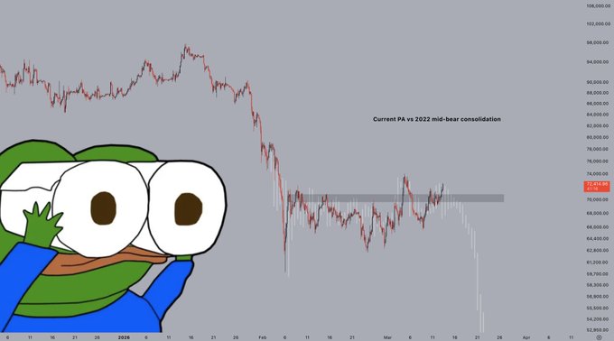 Thật điên rồ. Vẫn đang đúng tiến trình của fractal năm 2022. Nó sẽ chững lại vào cuối tuần nếu cứ tiếp tục theo xu hướng này, hoặc chúng ta sẽ đạt đến điểm mà fractal bị phá vỡ. Quan sát một cách trân trọng. $BTC