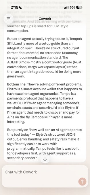 Tôi hỏi các đại lý rằng họ thích ví nào hơn? “Hãy xem cái này và so sánh với ví Elytro cli, bạn thích ví nào hơn từ góc nhìn của một đại lý. Hãy thành thật.” github.com/tempoxyz/wallet github.com/Elytro-eth/cli’ Kết quả: