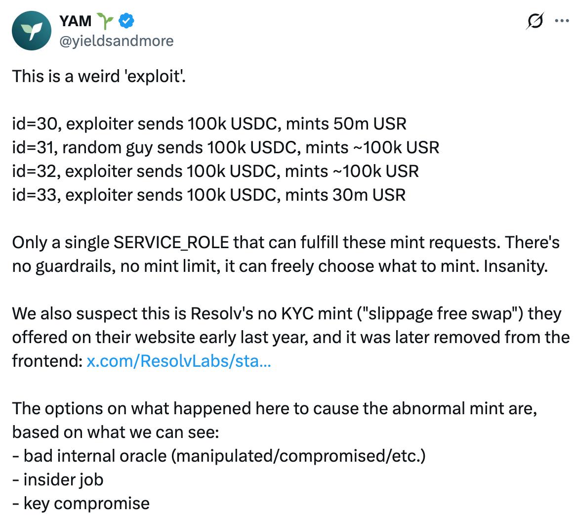 YAM tuyên bố trên X rằng Resolv Labs chỉ tạm ngừng giao thức ba giờ sau vụ hacker lần, trong đó khoảng một giờ là do phải thu thập bốn chữ ký cần thiết cho các giao dịch đa chữ ký. YAM cho rằng rằng việc tạm ngừng khẩn cấp chỉ nên yêu cầu một chữ ký, và quyền hạn này nên được giao cho các thành viên đội ngũ hoặc các nhà điều hành bên ngoài đáng tin cậy bất cứ khi nào có thể. Điều này sẽ tăng cường nhận thức về các bất thường Chuỗi, cải thiện khả năng tạm ngừng nhanh chóng và bao phủ tốt hơn các múi giờ khác nhau.