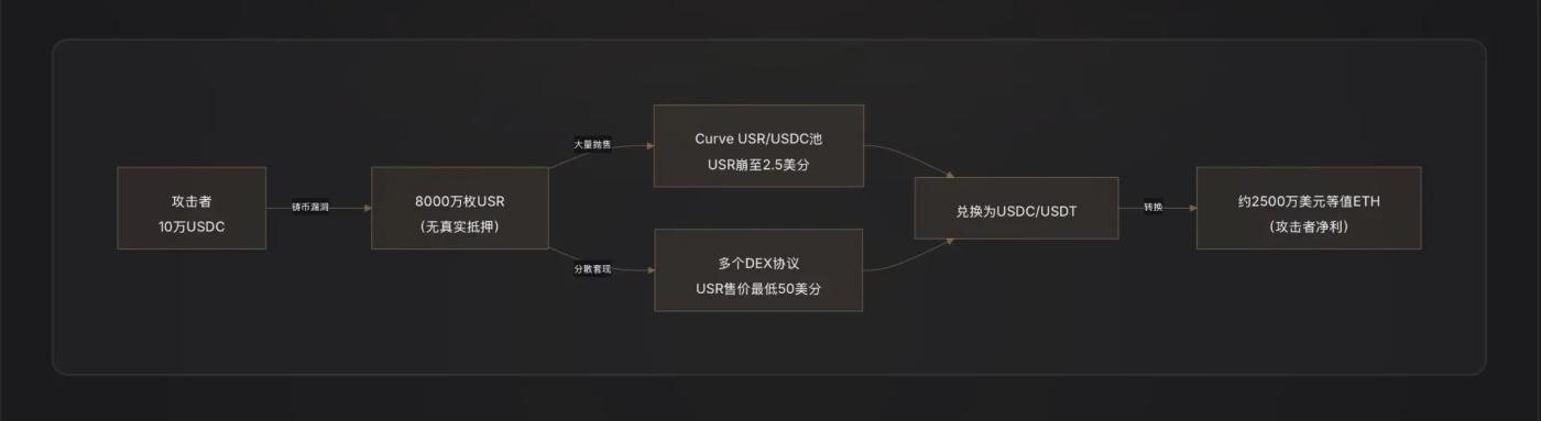 Do thanh khoản của Curve có hạn, khi 80 triệu USR đột ngột đổ vào, hệ thống đã bị quá tải hoàn toàn—giá USR lao dốc từ 1 đô la xuống còn 2,5 cent trong 17 phút. Những kẻ tấn công không có ý định bán tất cả ở mức 1 đô la, mà là dần dần đổi chúng lấy USDC/USDT trong khoảng từ 0,25 đến 0,50 đô la, cuối cùng chuyển đổi số tiền chênh lệch giá thành ETH để hoàn tất việc rút tiền.