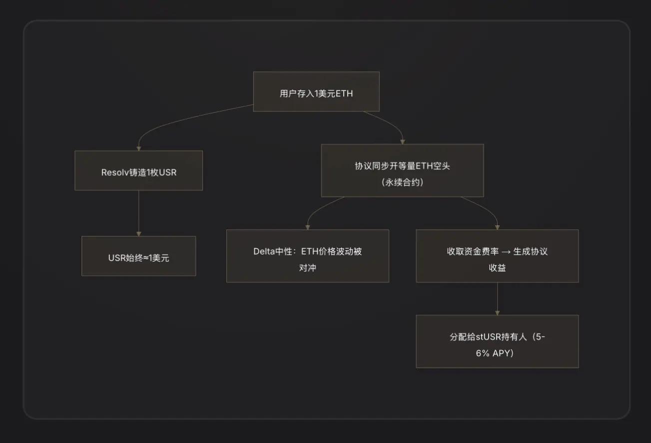 Khi bạn gửi 1 đô la ETH đúc 1 USR, giao thức Resolv đồng thời mở một vị thế đầu cơ giá xuống tương đương bằng ETH trên thị trường hợp đồng vĩnh cửu. Nếu ETH tăng, spot sẽ có lãi trong khi thị trường hợp đồng sẽ lỗ; nếu ETH giảm, thị trường hợp đồng sẽ có lãi trong khi spot sẽ lỗ—hai điều này bù trừ cho nhau, và tài sản ròng luôn duy trì ở mức xấp xỉ 1 đô la. Điều này giúp tách USR khỏi giá ETH trong khi vẫn duy trì tỷ giá cố định 1:1 với đô la Mỹ [Ghi chú 2].