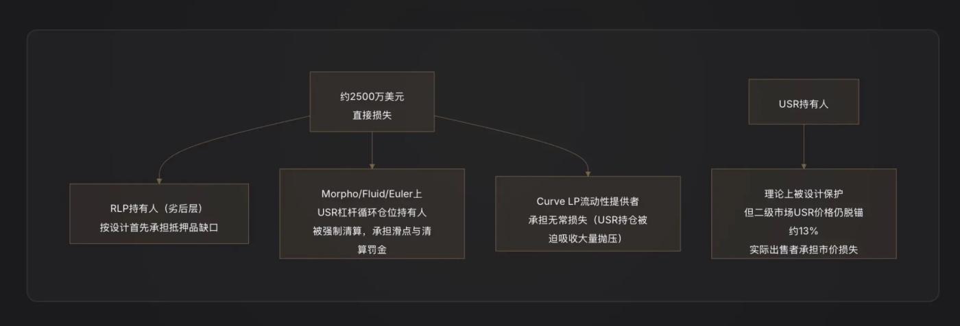 Nhà cung cấp thanh khoản NHÀ CUNG CẤP THANH KHOẢN của Curve chịu Tổn thất tạm thời— khi kẻ tấn công bán lượng lớn USR, nhóm NHÀ CUNG CẤP THANH KHOẢN sẽ tự động hấp thụ lượng lớn USR từ "50% USR/50% USDC" (bán USDC và nắm giữ nhiều USR có giá thấp hơn), dẫn đến tổn thất chênh lệch giá [Chú thích 8].