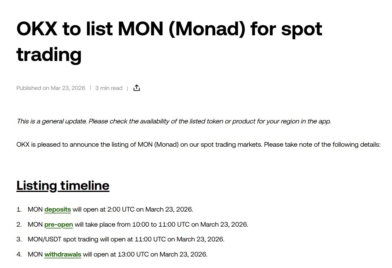 Chính thức TechFlow , vào ngày 23 tháng 3, OKX sẽ ra mắt giao dịch giao spot MON (Monad).