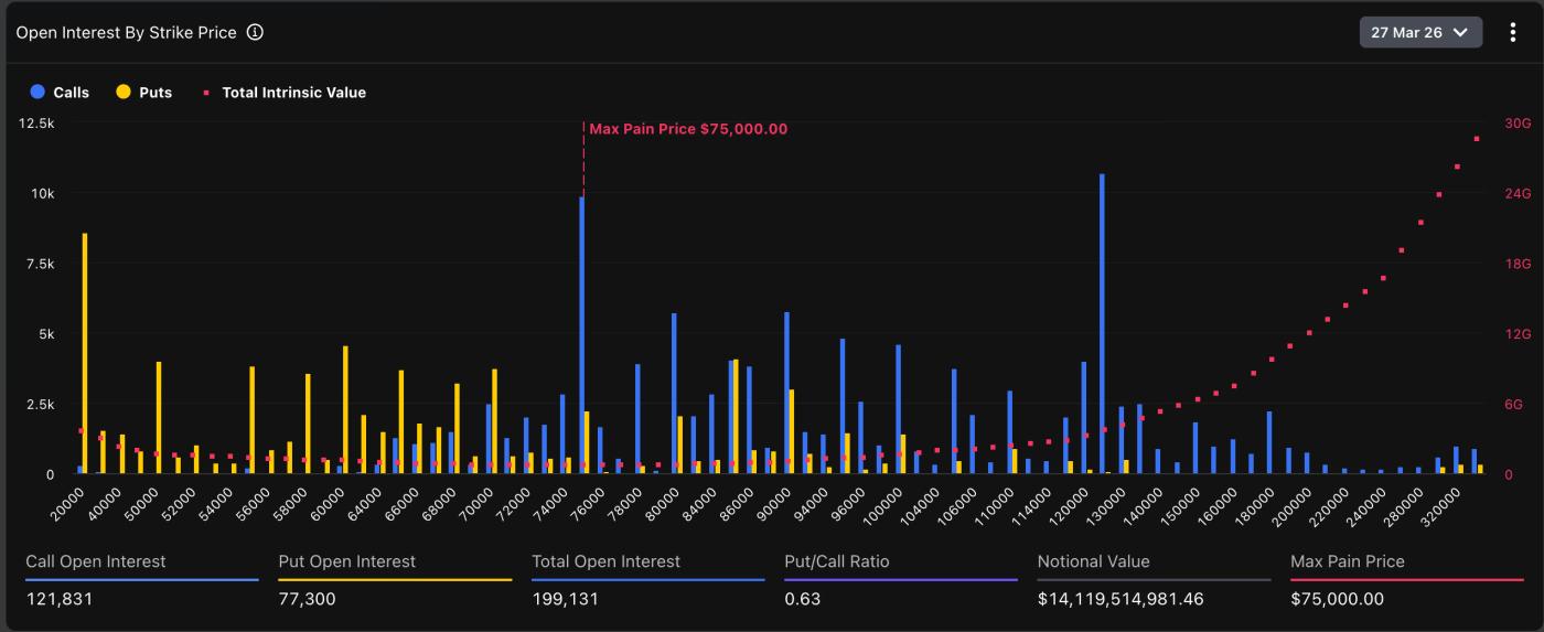 Theo dữ liệu của Deribit, mức “max pain” — mức mà tại đó nhiều hợp đồng nhất sẽ hết hạn vô giá trị (giống như những tấm vé số không trúng thưởng) — nằm ngay tại 75.000 USD.